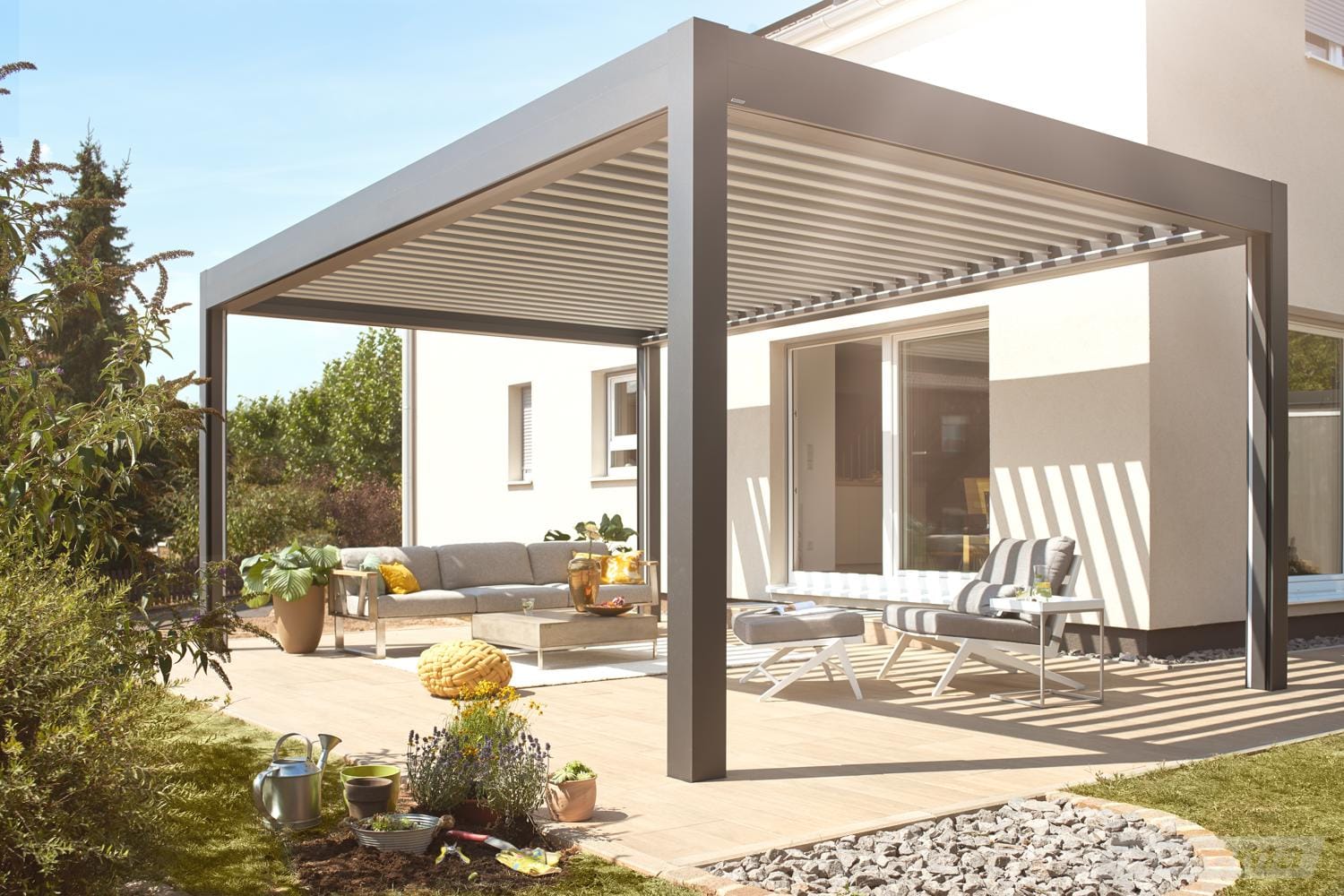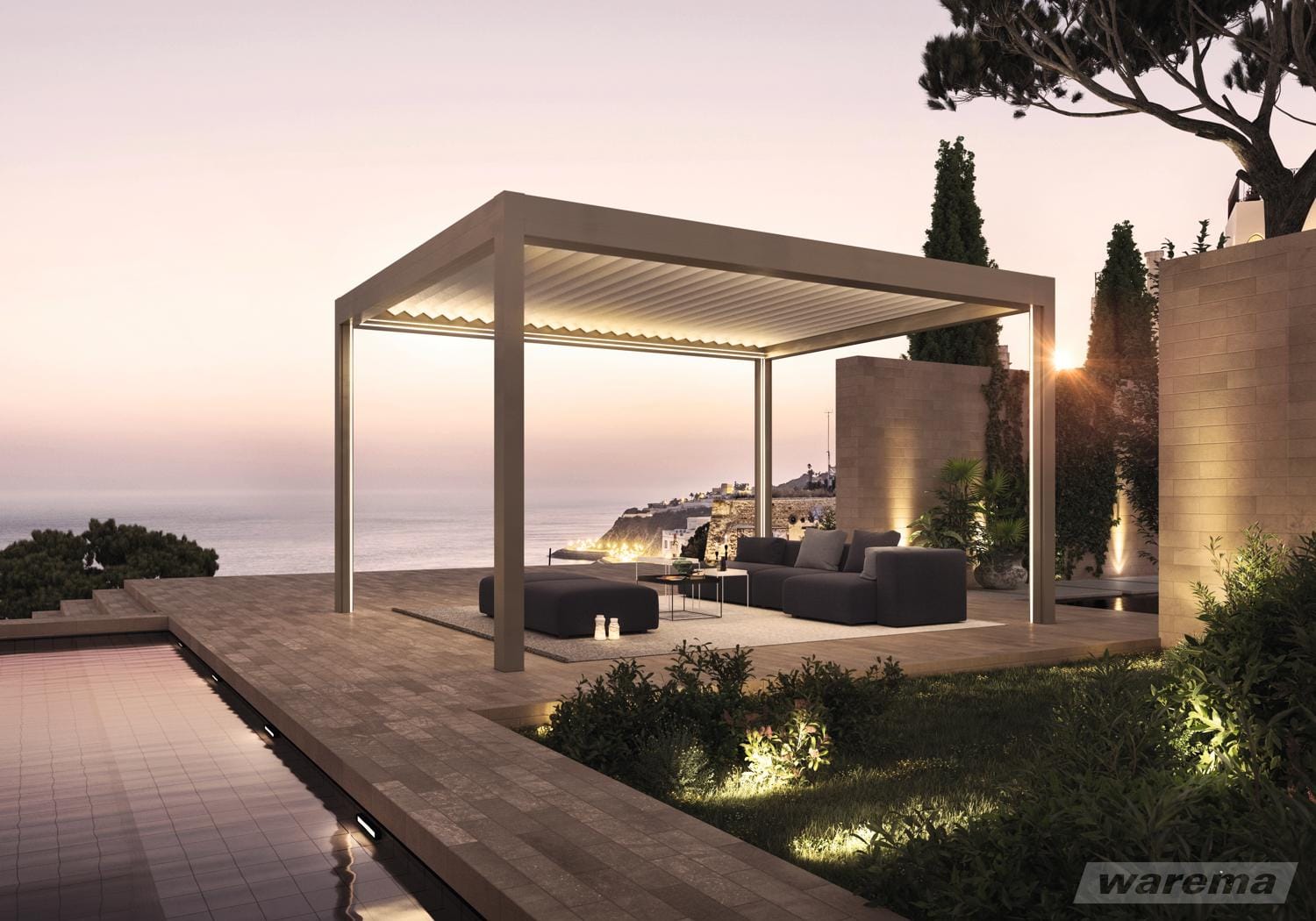 Under ett Lamaxa lamelltak spelar det ingen roll om det är svala morgontimmar, stekande lunch sol eller kväll när det skymmer. Tack vare den perfekta designen och integrerade belysningen passar en Lamaxa hela dygnet.